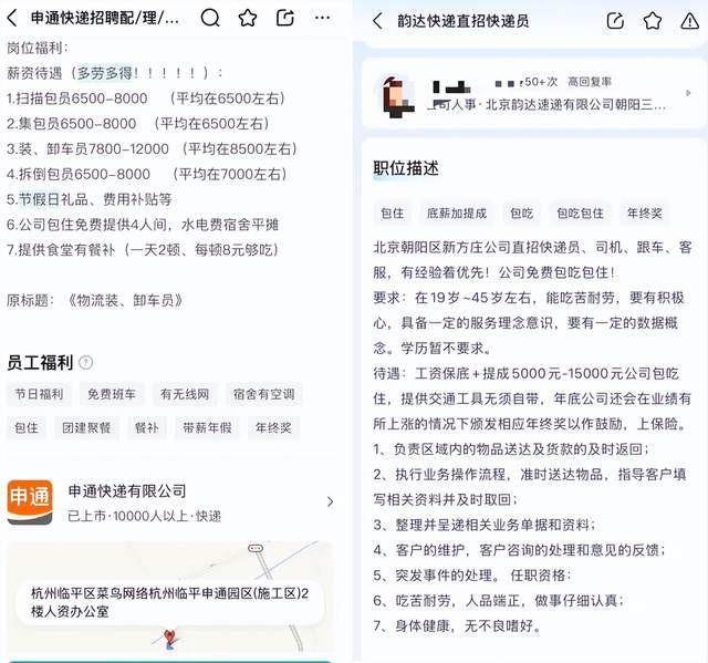 而BOSS、智联等招聘平台上,申通快递员的招聘信息和商家对五险一金的缴纳也不统一。比如BOSS招聘平台上,“申通快递有限公司”只强调了薪资待遇多劳多得,有节假日补贴,但未明确社保缴纳情况,北京鹏起申通货运代理有限公司则明确提供完善的社保;智联招聘上,韵达、顺丰等招聘信息则明确表示缴纳社保。