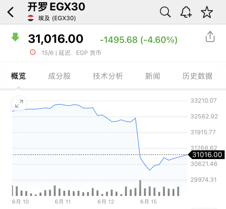 上周国际市场风云变幻,特别是中东紧张局势升级震动市场,全球资本市场风险偏好普遍下行。北京时间周日(6月15日),率先开盘的中东股市多数下跌,该地区市场多数于上周五休市。其中,埃及主要股指开罗EGX30指数盘初下跌7.7%,创一年多来最大跌幅,是中东地区表现最差的市场之一。