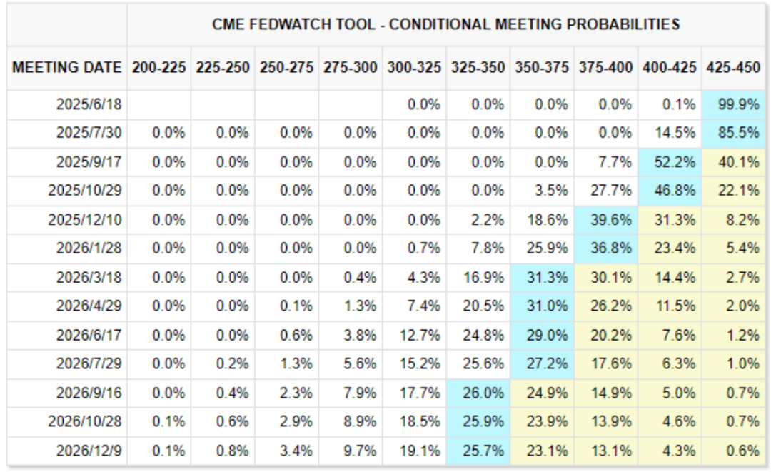 具体来看,北京时间周四(6月19日),美联储将公布最新利率决议。目前,期货市场押注美联储本次“按兵不动”的概率高达99%,投资者将密切关注本季度更新的经济预测及其点阵图会释放出哪些有关未来降息路径的信号。